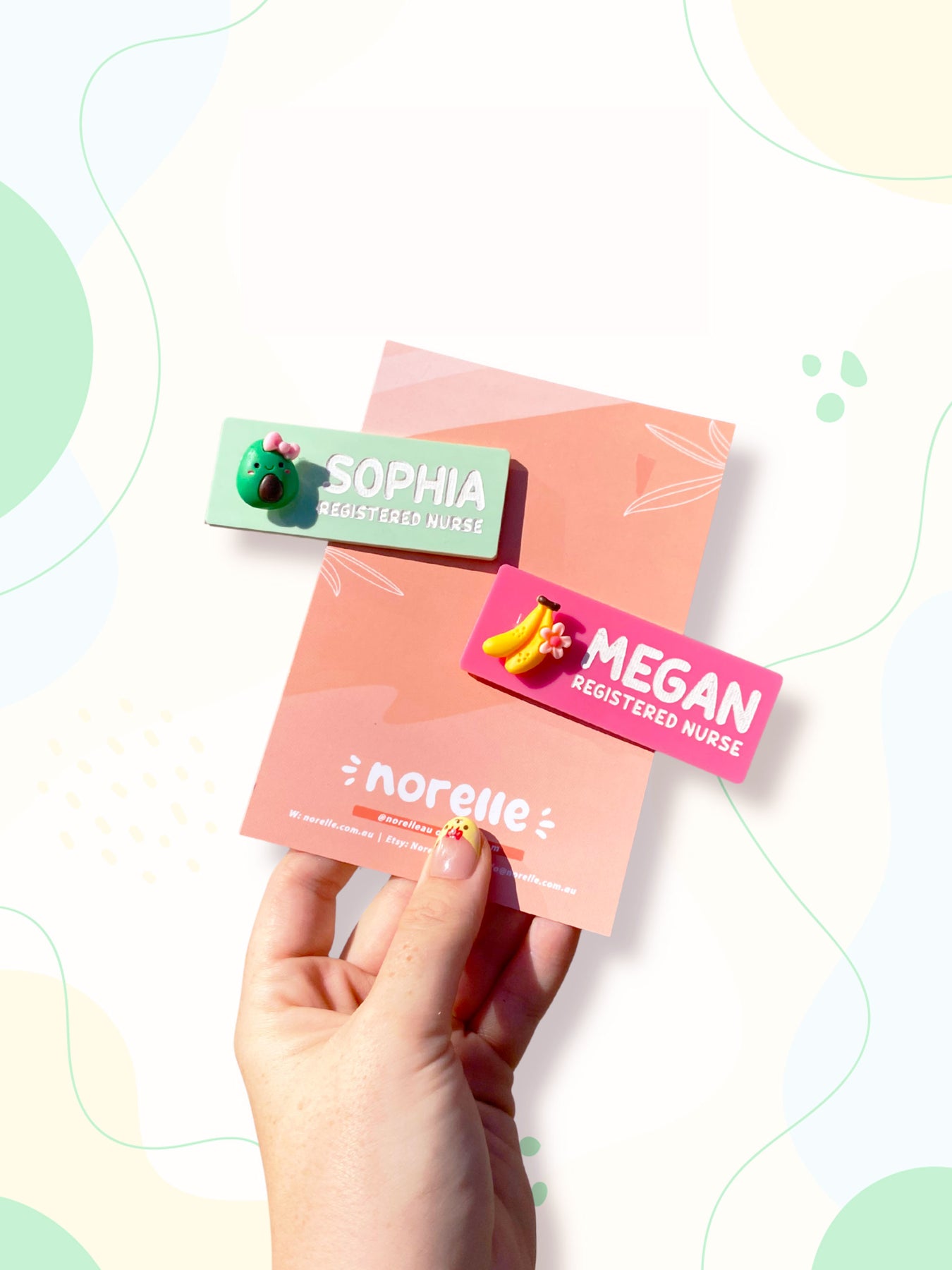 These badges include an adorable fruit embellishment. Select from the options of an avocado or banana. Colours shown in photo for reference are Mint (avocado) and Bubblegum (banana)